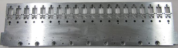 產(chǎn)品名:硬盤碟片掛桿 材料:PEEK 主要工藝:CNC 技術(shù)難點(diǎn): --塑料材質(zhì)所有齒深度公差:[2.5±0.01] --所有齒型中心距公差:[±0.025] | 產(chǎn)品名:HGA凹模 材料:CD 650 主要工藝:電火花,拋光 技術(shù)難點(diǎn): --凹模曲面電火花加工表面粗糙度Ra 0.1以內(nèi); --凹模曲面輪廓度0.0015mm以內(nèi); -- 100投影儀檢測(cè)凹模曲面輪廓度; -- 200倍工具顯微鏡檢測(cè)確保凹模光面Ra0.1均勻一致 | 產(chǎn)品名:針載板 材料:ESD POM 主要工藝:CNC 技術(shù)難點(diǎn): -- 132處Ф0.20mm精孔, --直線度0.005mm; --位置精度 0.005mm。 |